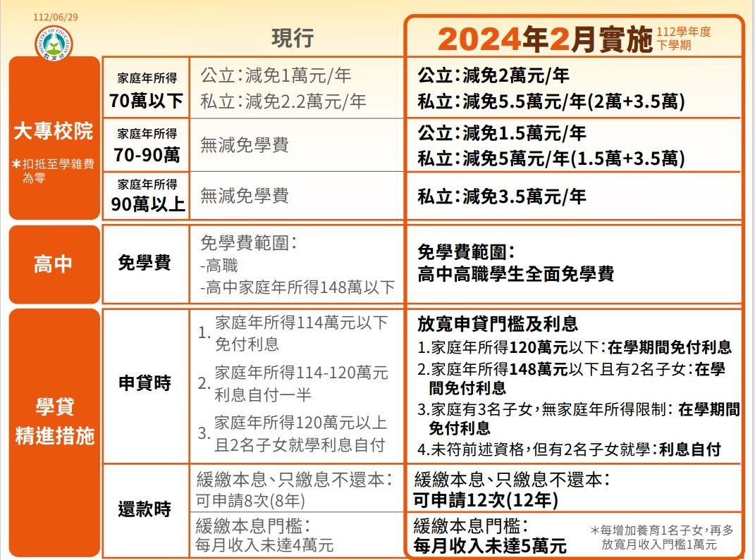 中小學今天(16日)開學,下周起各大學也將陸續開學。高中職免學費、私立大專校院學雜費補助3.5萬,從2月1日起實施,新學期起適用,受惠學生超過60萬人,